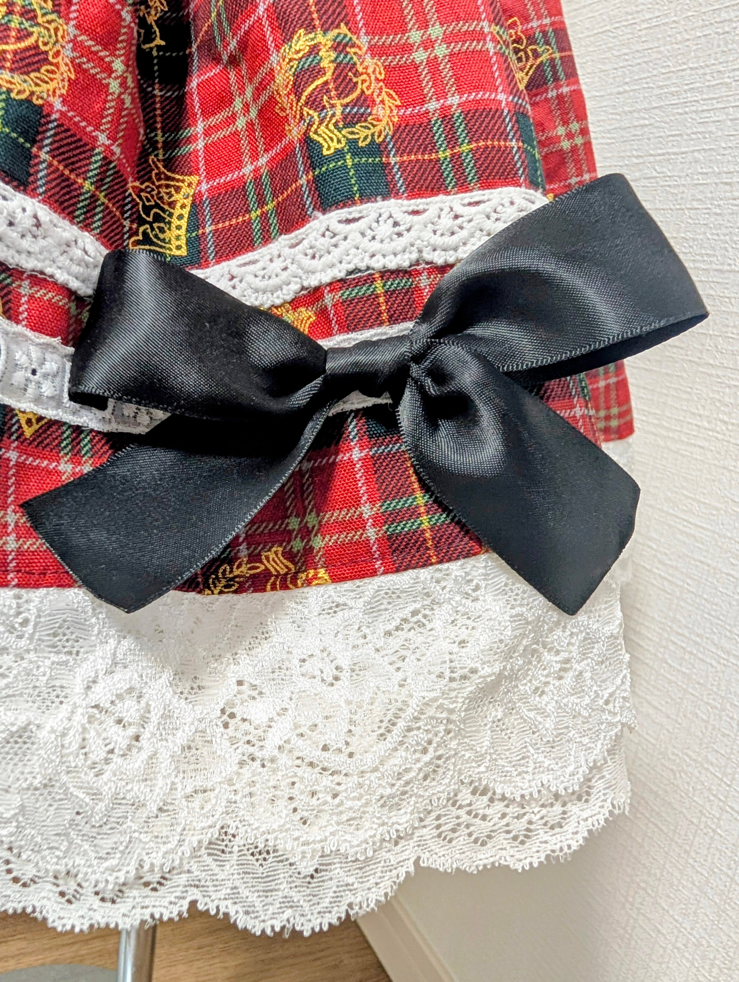 赤タータンチェックに容赦なく盛られた綿レース、ハシゴレースに黒リボン、幅広レース暴力的なボリュームが平成風のスカートです。