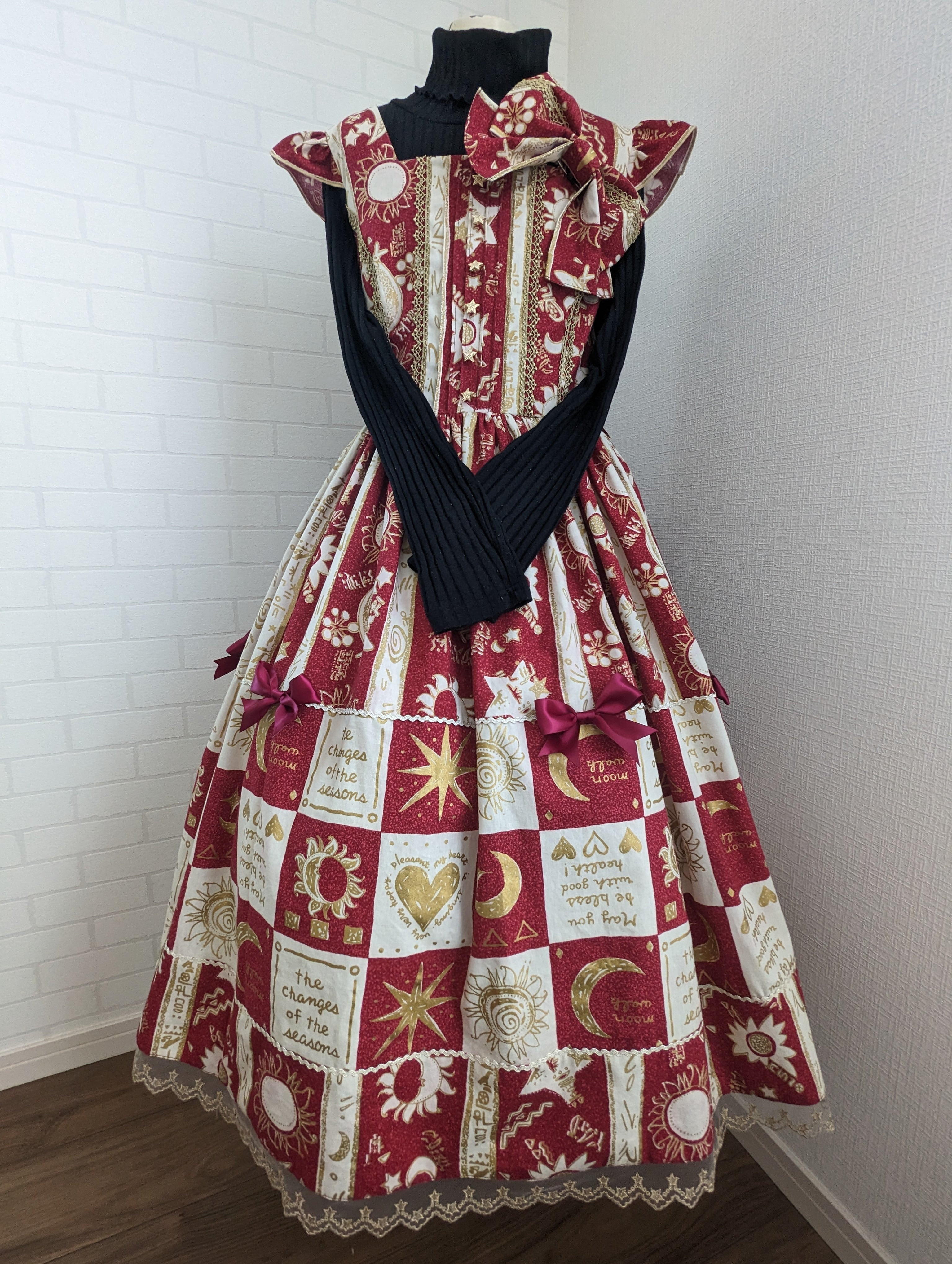 太陽、月、星が古代エジプトを思わす個性的な生地でJSKを仕立てました。